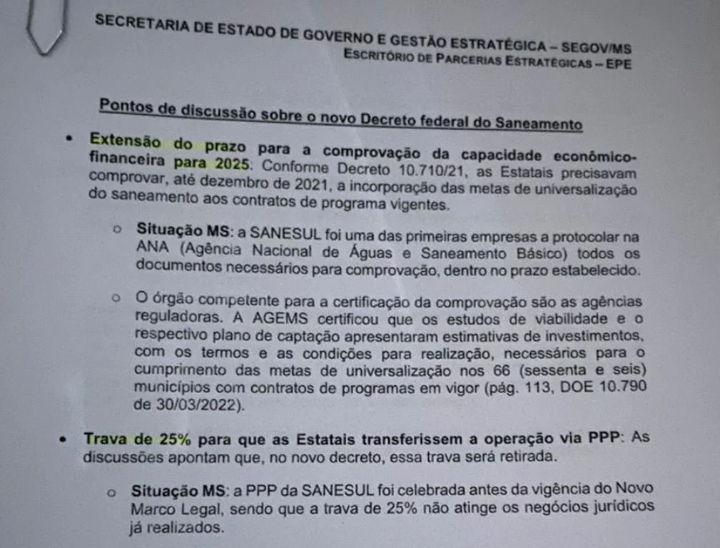 Ao destacar trechos dos decretos assinados pelo presidente da República, em cerimônia no Palácio do Planalto, Barbosinha diz que “tudo o que o Governo Federal anuncia agora como medidas para flexibilizar as companhias, no que se refere às estaduais, a Sanesul já tinha atingido ainda em 2022”, quando aderiu ao modelo de contrato via PPP (Parceria Público Privada) e que vai resultar na universalização do esgotamento sanitário em dez anos nos 68 municípios atendidos pela estatal, com a garantia de um investimento de R$ 3,8 bilhões e uma tarifa sem custo adicional para os usuários dos serviços, até 2031.
