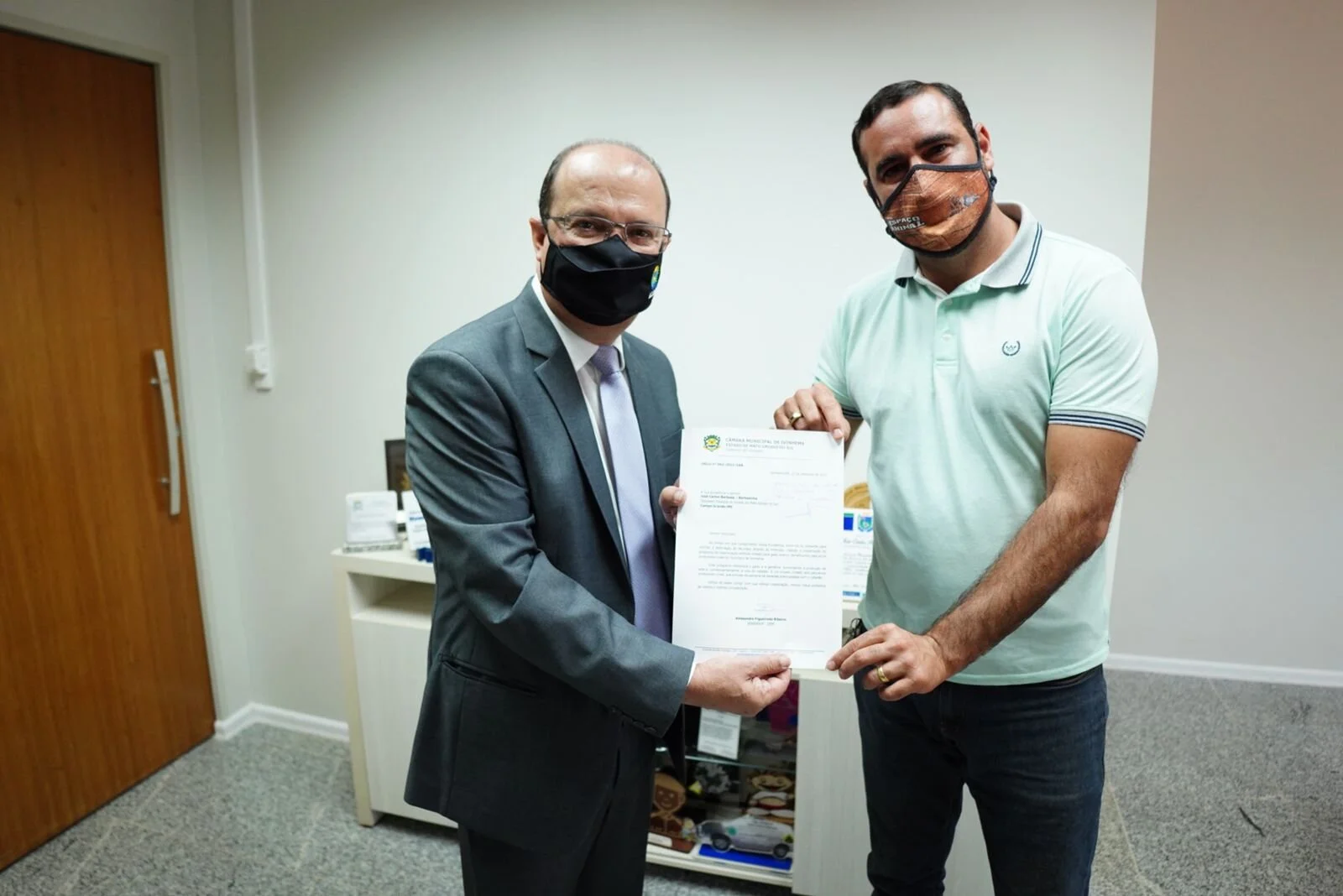 O vereador Alessandro Pet Shop entrega pedido ao deputado durante visita na Assembleia