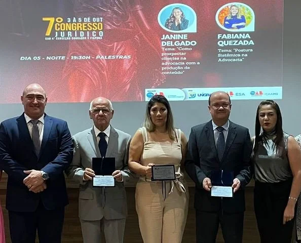 Além do vice-governador Barbosinha, a OAB também homenageou, na abertura da programação de encerramento do Congresso realizado na Unigran, os profissionais Milton Batista Pedreira, Ana Paula Monteiro e Elen Franco Amaral. Em seguida foram realizadas as palestras com a diretora da entidade em Dourados, Janine Delgado (“Como prospectar clientes na advocacia com a produção de conteúdo”) e a convidada Fabiane Quesada, presidente da Comissão de Direito Sistêmico da OAB-SP (“Parceria Sistêmica na Advocacia”).