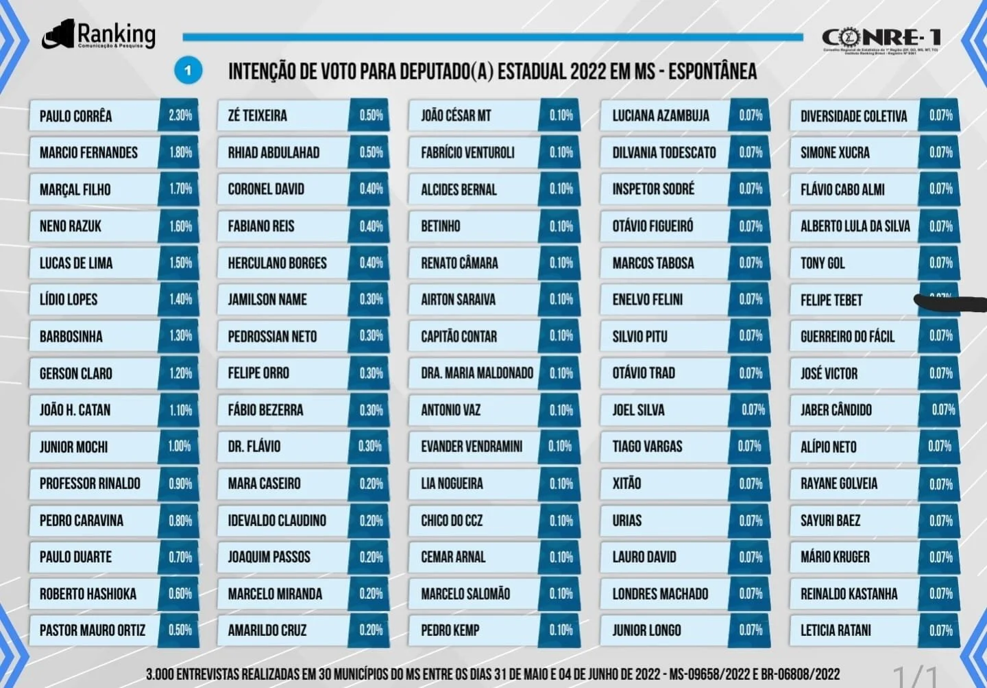 Barbosinha teve 1,30% das citações entre os três mil eleitores entrevistados acima de 16 anos em 30 municípios do Estado. A pesquisa foi realizada entre os dias 31 de maio e 04 de junho de 2022, registrada no TSE com os números: MS-09658/2022 e BR-06808/2022 para apontar a avaliação popular sobre a eleição deste ano.