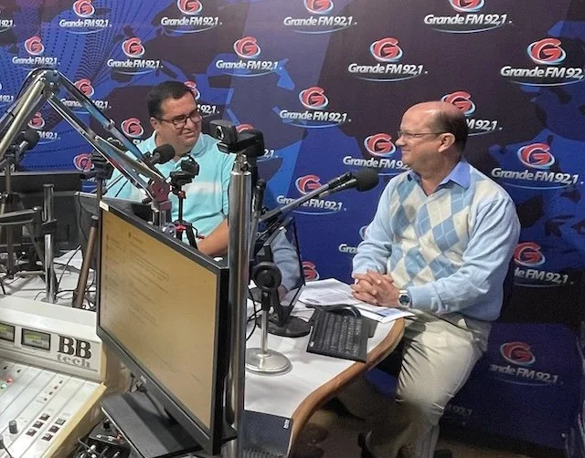 Barbosinha, com o gerente operacional da Sanesul, Madson Valente, na rádio Grande FM